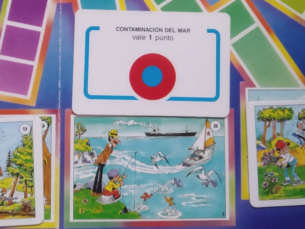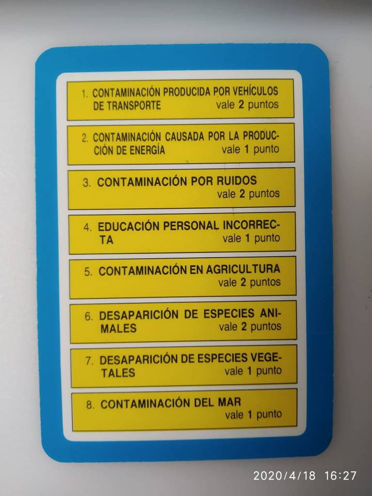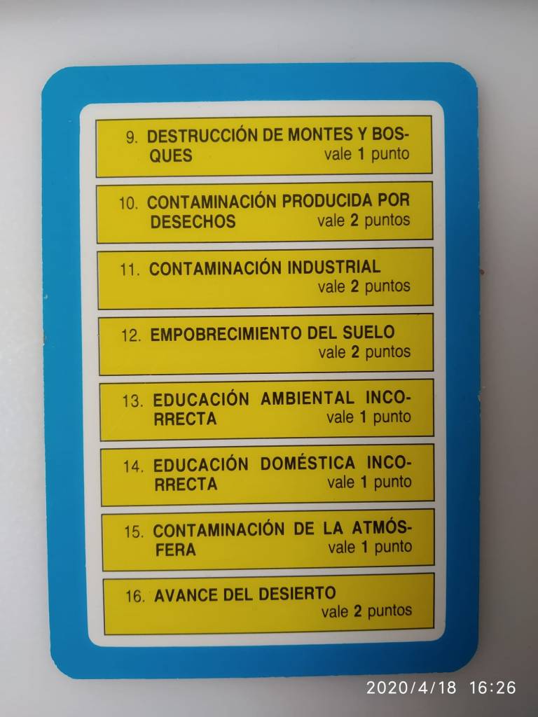 Es un juego de preguntas y respuestas que consiste en obtener el mayor número de puntos posibles resolviendo problemas ambientales. Cada una de las tarjetas de los extremos representa uno de los 16 problemas ambientales. La carta ilustra una mala práctica, un problema, un uso erróneo. Cuando resolvemos ese problema, cogemos la carta y desvelamos el dibujo que escondía, la práctica “ideal” para ese espacio, y anotamos la puntuación correspondiente para cada problema.